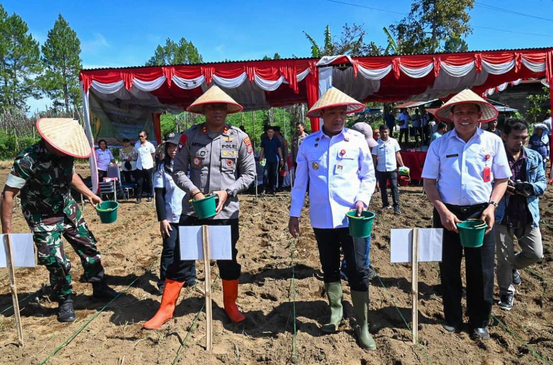 Bupati Humbang Hasundutan Dr Oloan P Nababan SH MH bersama Kapolres Humbang Hasundutan AKBP Arthur Sameaputty termasuk TNI dan masyarakat melakukan penanaman benih jagung di Desa Pasaribu Kecamatan Doloksanggul, Rabu 8 Oktober 2025. Penanaman serentak ini merupakan komitmen bersama untuk mewujudkan swasembada pangan secara nasional.