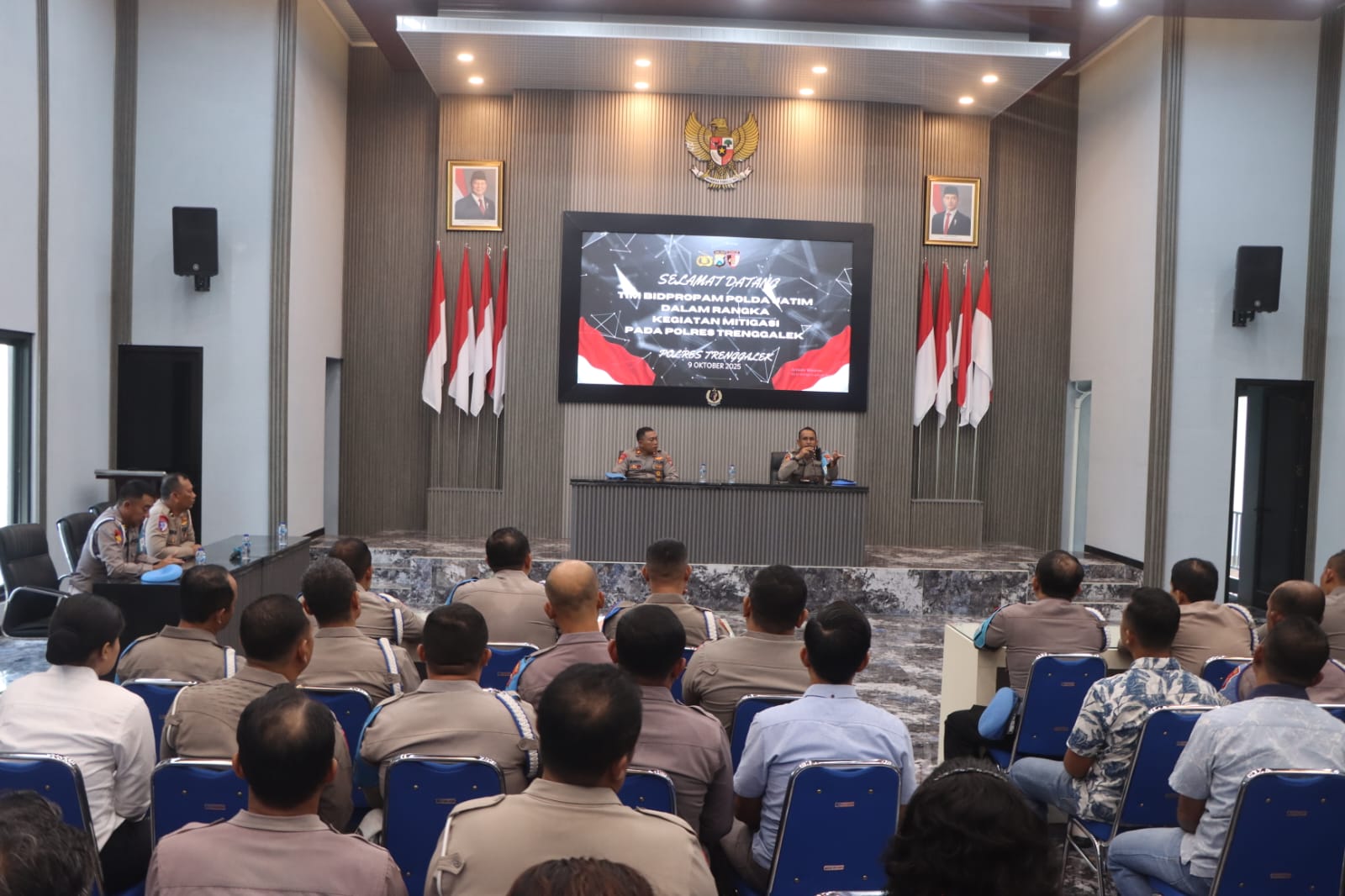 TRENGGALEK | Kepolisian Resor Trenggalek menerima kunjungan kerja dari Polda Jatim. Tak sekadar berkunjung, Tim dari Bidpropam Polda Jatim ini Juga menggelar serangkaian kegiatan mitigasi dan pengawasan melekat terhadap anggota berikut operasional di lapangan. Kamis, (9/10/2025).