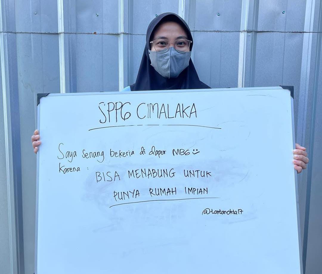 Sementara itu, Tiara, salah seorang pekerja di dapur MBG Cimalaka, menyampaikan alasannya dengan penuh kasih. “Saya senang bekerja di dapur MBG karena ada mamah yang harus dibahagiakan,” tulisnya.