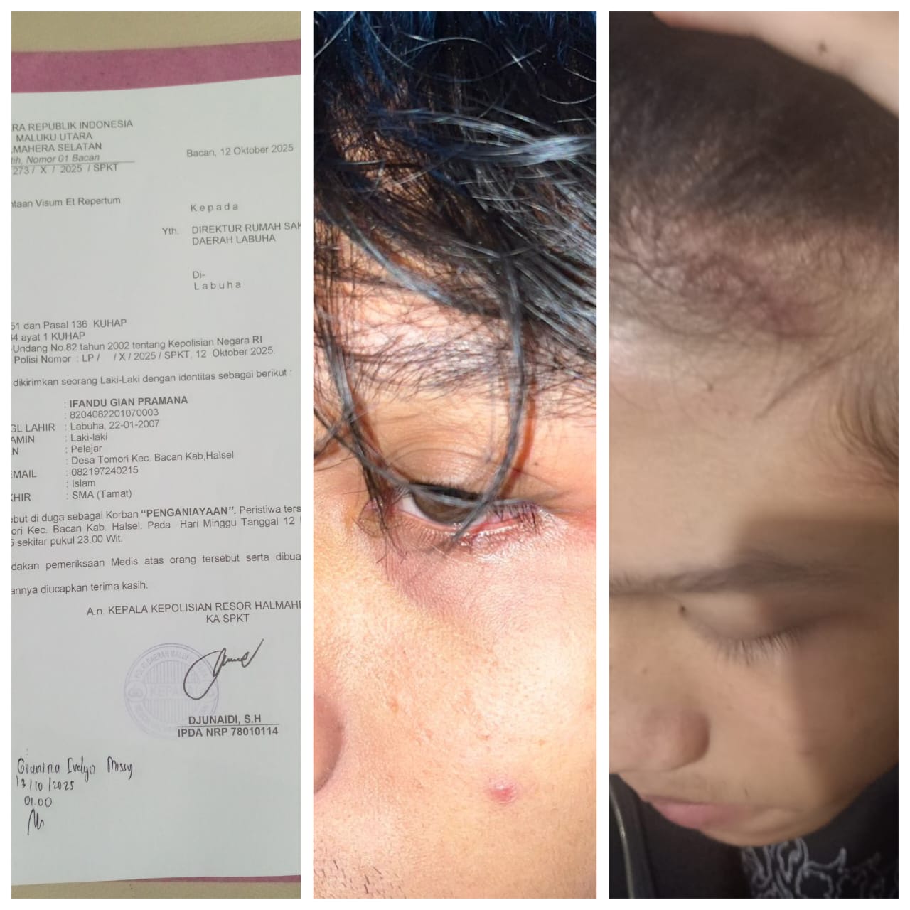 Labuha, Global Investigasi News – Kepolisian Resor (Polres) Halmahera Selatan didesak untuk segera menangkap seorang pria bernama Akbar yang diduga telah melakukan tindak penganiayaan terhadap seorang pemuda bernama Fandu. Kejadian ini terjadi pada malam hari, tepatnya pukul 23.00 WIT, di kawasan Lapangan Merdeka Labuha, Kecamatan Bacan, Kabupaten Halmahera Selatan, Provinsi Maluku Utara. 12/10/2025.