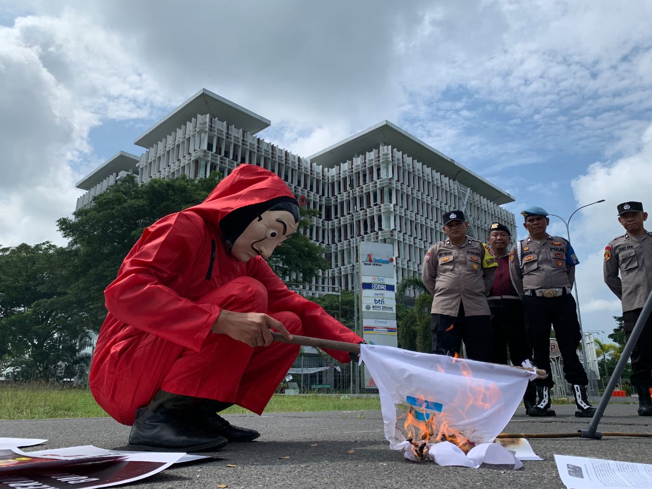 Terlihat di lokasi, pria bertopeng tersebut melakukan aksi membakar bendera Inalum sebagai simbol perlawanan terhadap kesewenangan.