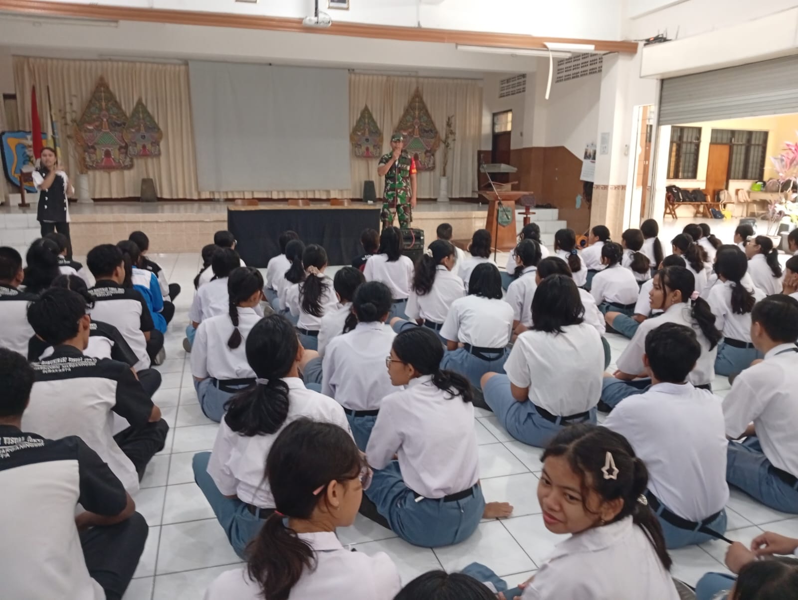 Surakarta – Babinsa Kelurahan Punggawan Koramil 02/Banjarsari Kodim 0735/Surakarta Serka Junaidi melaksanakan kegiatan pembunaan ketahanan wilayah (Binwanmil) dengan memberikan materi wawasan kebangsaan kepada Siswa – Siswi SMK Marsudirini Surakarta bertempat di Aula sekolah Jl. Madyotaman No. 1 Kelurahan Punggawan Kecamatan Banjarsari, Selasa (28/10/2025).