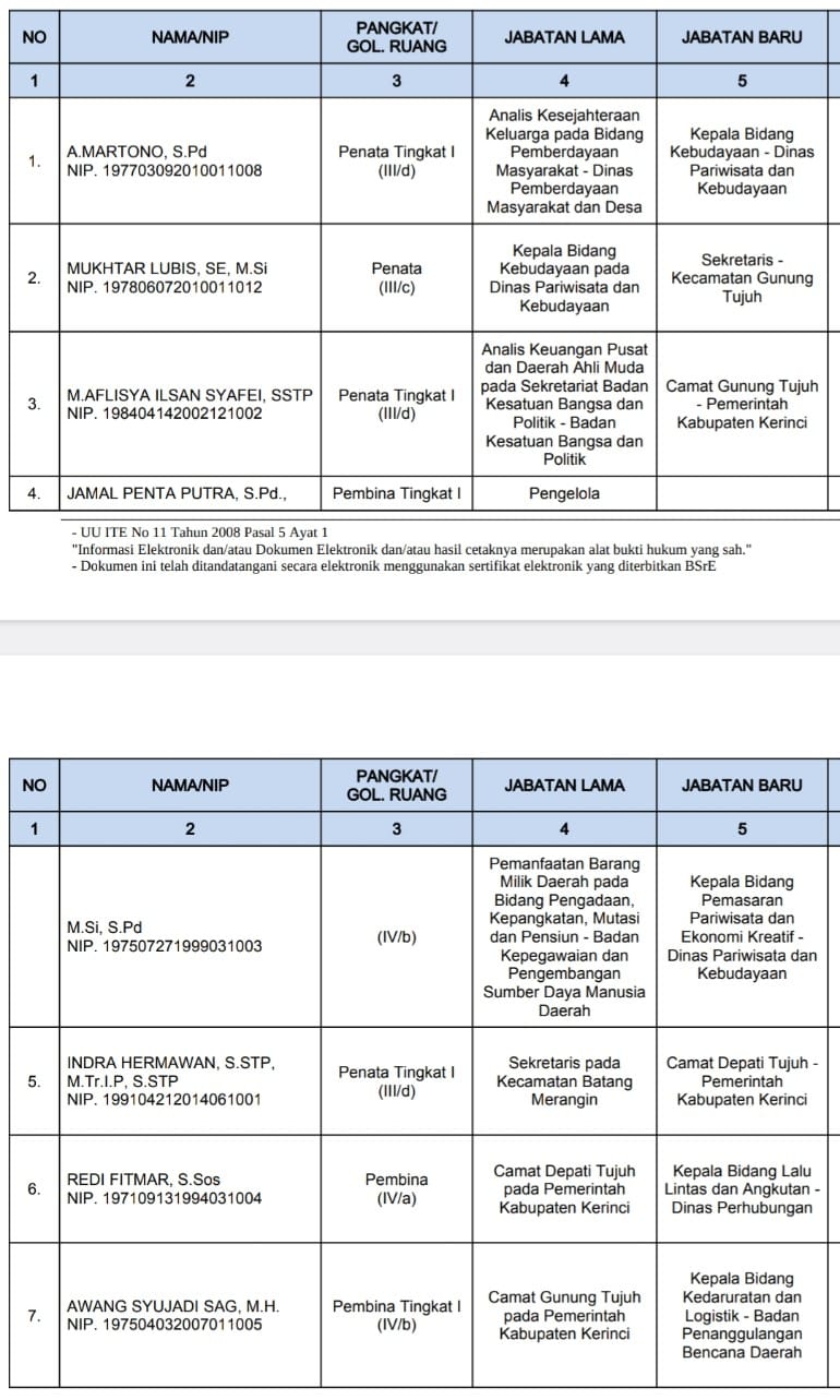 Adapun nama pejabat yang dilantik diantaranya Martono dilantik sebagai Kabid Pariwisata dan Kebudayan Kerinci.