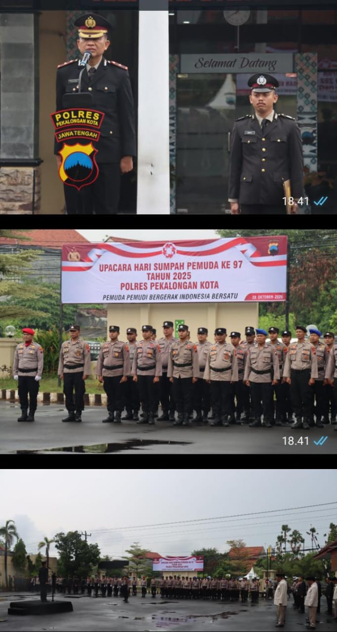 Upacara Peringatan Hari Sumpah Pemuda Ke-97 Tahun 2025 mengusung tema “Pemuda Pemudi Bergerak, Indonesia Bersatu”. Bertindak sebagai inspektur upacara Wakapolres Pekalongan Kota Kompol Pujiono, S.H., M.M., dan diikuti para PJU, Pleton Perwira, Pasis Akpol, Polwan, pasukan Dalmas bersenjata, gabungan staf, pleton Sat Lantas, gabungan Sat Reskrim, Intel dan Narkoba, serta pleton ASN Polri.