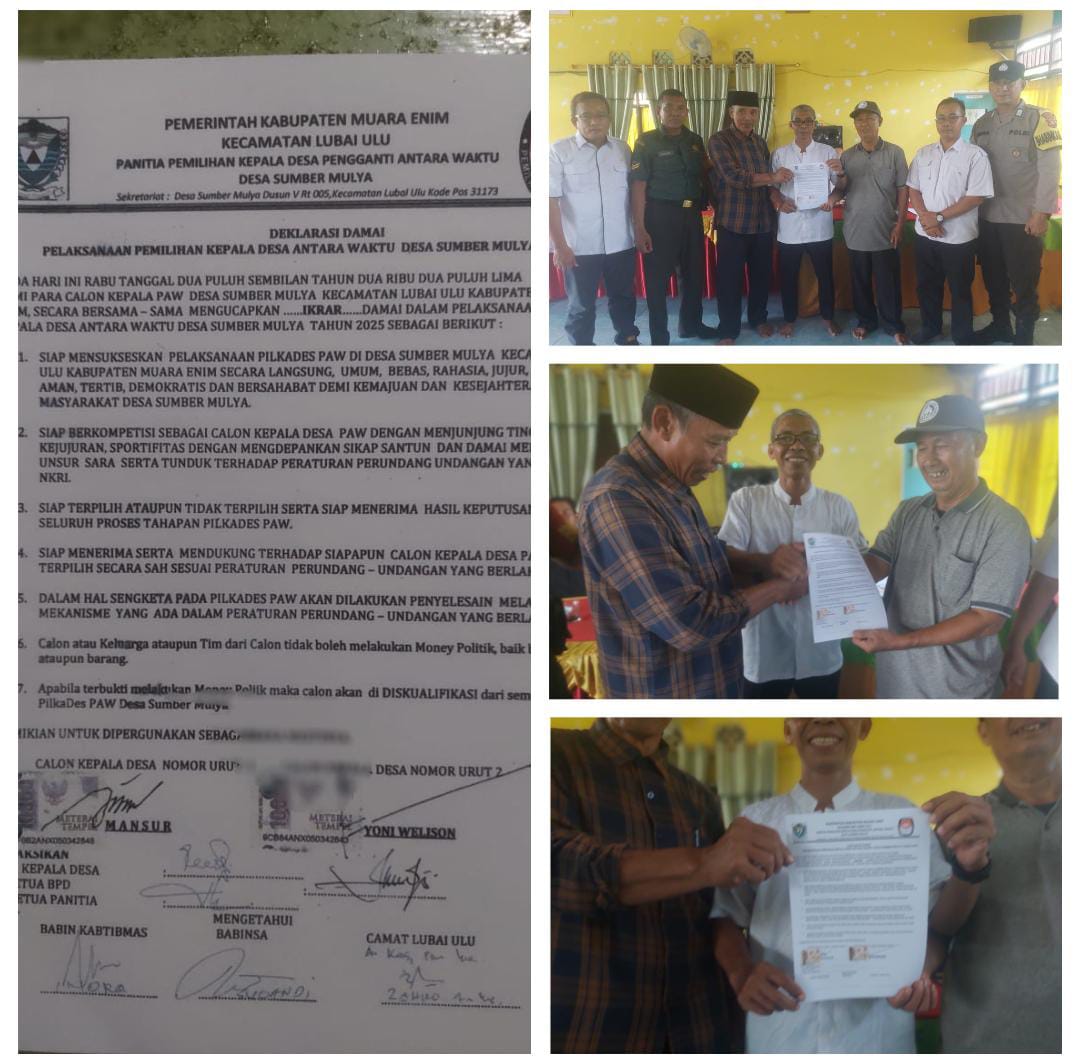 Deklarasi Damai pelaksanaan Pemilihan Kepala Desa Antara Waktu Desa Sumber Mulya Tahun 2025 Ke 2 Calon telah bersepakat serta mengucapkan IKRAR yang telah di Tanda tangani diatas matrai 10.000 rupiah dan terdapat 7 Aitem.