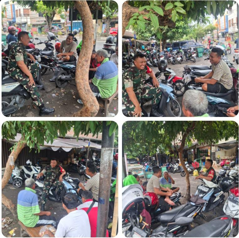 Surakarta, Babinsa Danukusuman Koramil 03/Serengan Kodim 0735 Surakarta Serda Tito melaksanakan Komsos dengan Bpk. Suryo di Halaman Pasar Harjodaksino Danukusuman Serengan Kota Surakarta, Senin pukul 09.00 Wib (03/11/2025)