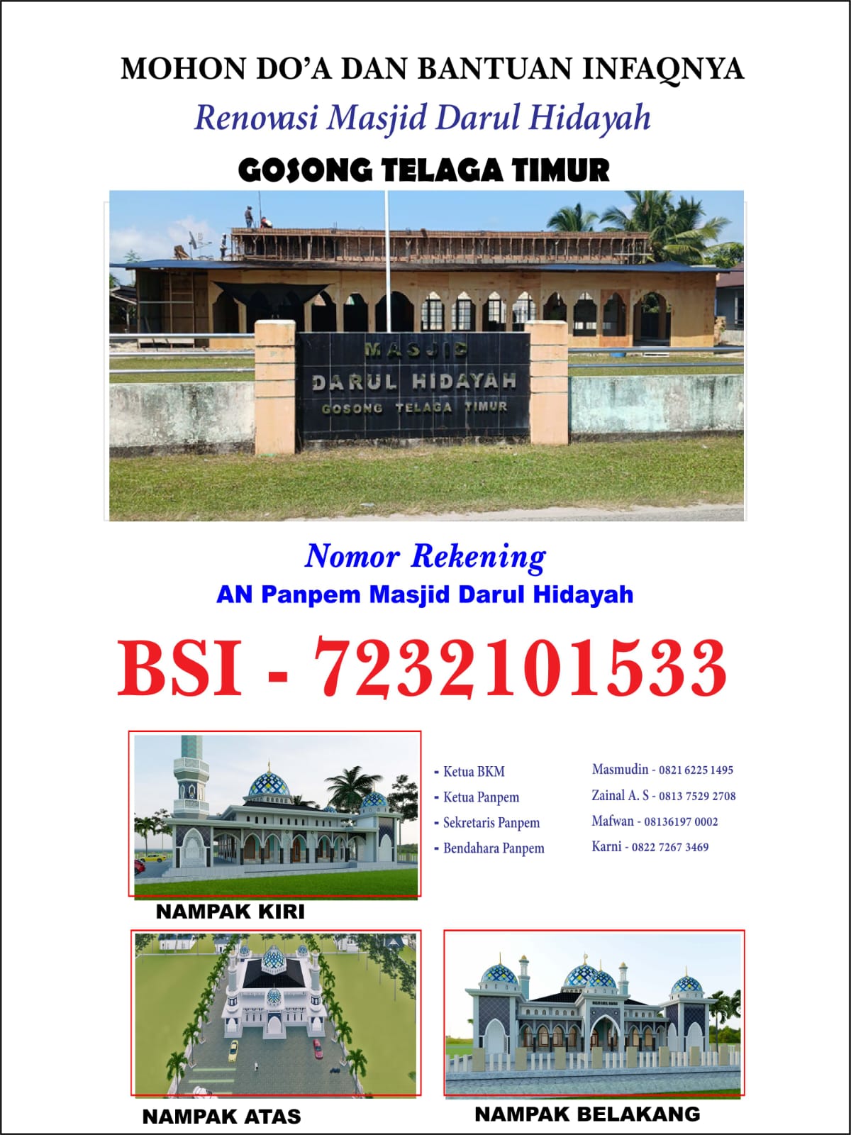 Panitia berharap uluran tangan dari kaum Muslimin dan Muslimat, baik dari dalam maupun luar desa, untuk turut berinfaq dan berdonasi di jalan Allah SWT demi menuntaskan pembangunan rumah ibadah ini.