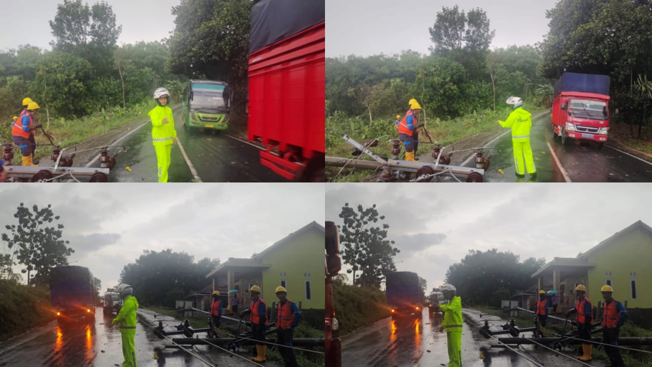 Aksi cepat tanggap dilakukan Satlantas Polres Way Kanan mengevakuasi tiang listrik milik perusahaan listrik negara (PLN) tumbang yang menutupi sebagian badan jalan Lintas Tengah Sumatera (Jalinsum) Kampung Suka Negeri Kecamatan Gunung labuhan Kabupaten Way Kanan. Selasa (4/11/2025).
