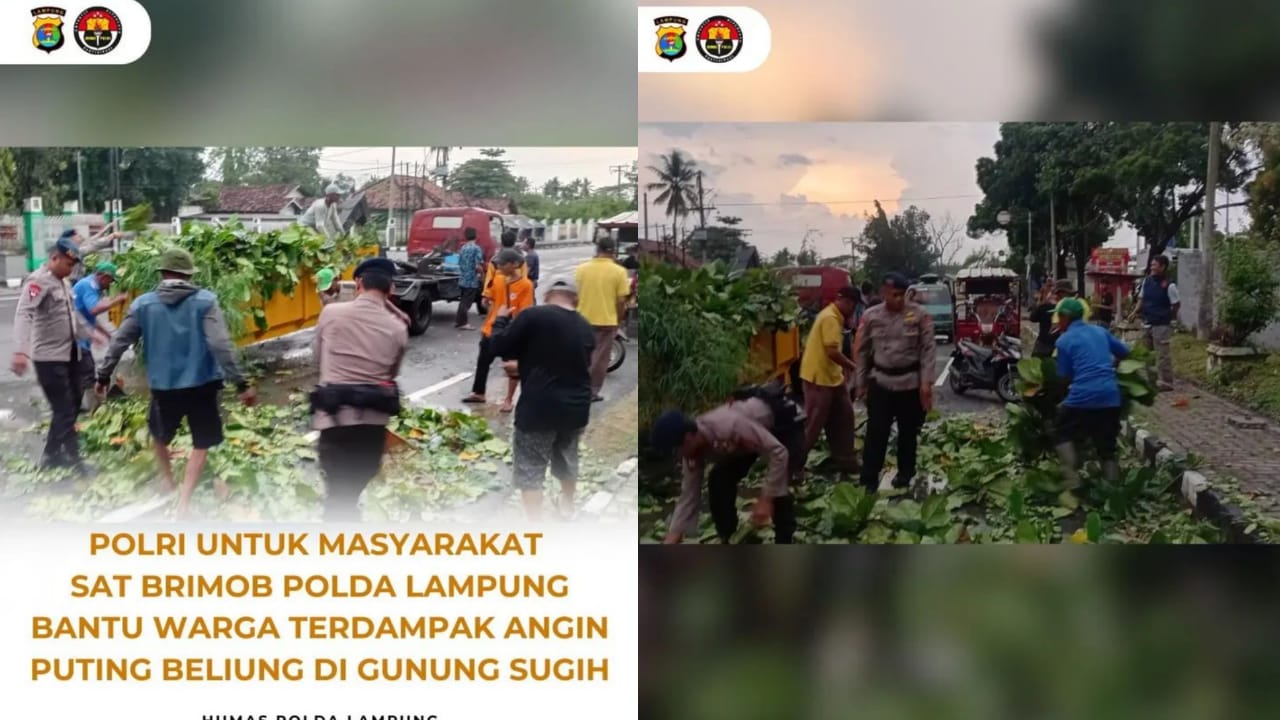 Sat Brimob Polda Lampung Kompi 4 Batalyon B Pelopor bergerak cepat membantu warga terdampak angin puting beliung di Kecamatan Gunung Sugih, Lampung Tengah, Selasa (4/11/2025)