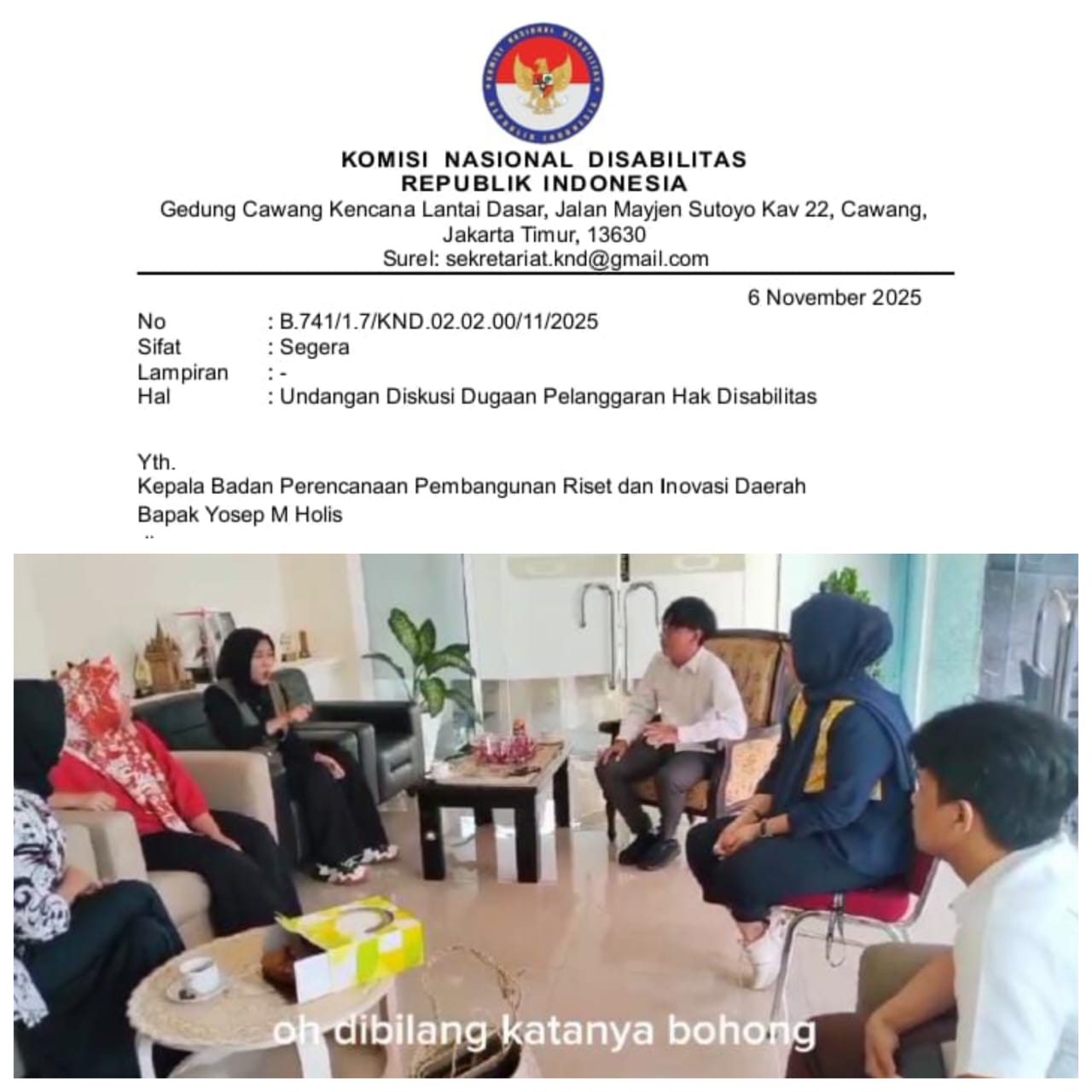 Surat tersebut ditandatangani Ketua Komisi Nasional Disabilitas, Dr. Dante Rigmalia, dan ditembuskan kepada Komisioner KND Dr. Rachmita M. Harahap, keluarga pelapor (Ratu dan Syifa), serta pihak-pihak yang diduga terlibat.