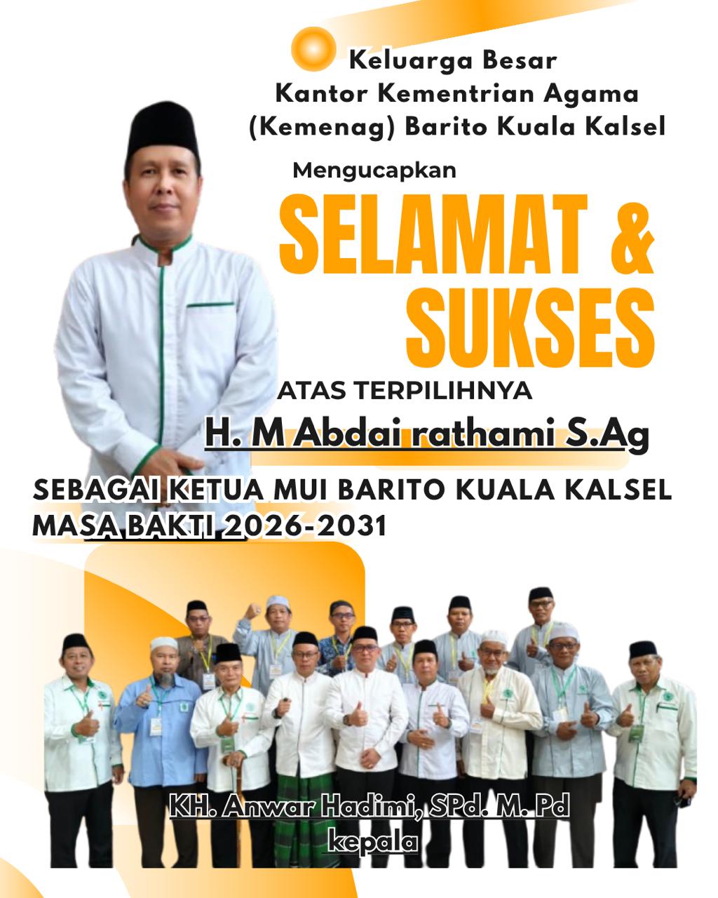 Kantor Kementerian Agama (Kemenag) Kabupaten Barito Kuala Provinsi Kalimantan Selatan Mengucapkan Selamat & Sukses atas Terpilihnya HM. Abdai Rathami, S.Ag Sebagai Ketua MUI Kabupaten Barito Kuala Masa Bakti 2026 – 2031