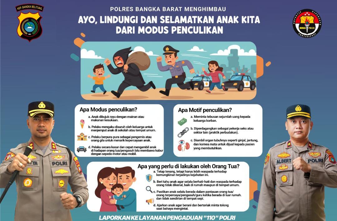 “Melalui kami, Kapolres Bangka Barat menghimbau seluruh orang tua untuk melindungi dan menyelamatkan anak-anak dari modus penculikan. Pastikan mereka selalu berada dalam pengawasan dan jangan mudah mempercayakan anak kepada orang yang tidak dikenal,” ujarnya.