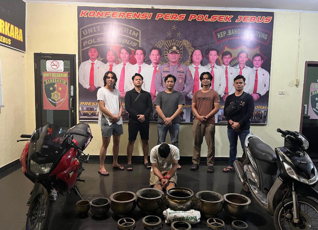 Barang bukti yang diamankan antara lain guci kuningan bercorak naga besar dan sedang, guci kuningan polos berbagai ukuran, kaki dudukan guci, logo naga kuningan, karung putih, serta dua unit sepeda motor tanpa nomor polisi, yaitu Kawasaki Ninja 150 RR dan Yamaha Mio Sporty. Semua barang bukti dibawa ke Mako Polsek Jebus untuk proses penyidikan lebih lanjut.