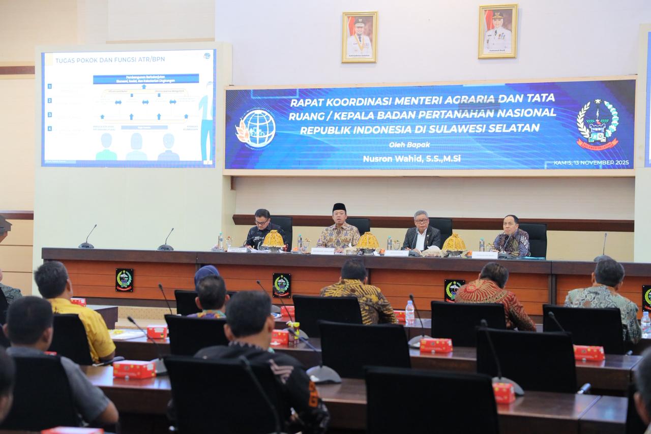 MAKASSAR – Global Investigasi News.com – Menteri Agraria dan Tata Ruang/Kepala Badan Pertanahan Nasional (ATR/BPN), Nusron Wahid, memimpin Rapat Koordinasi (Rakor) bersama kepala daerah se-Provinsi Sulawesi Selatan (Sulsel), di Kantor Gubernur Sulsel pada Kamis (13/11/2025). Rakor ini merupakan bagian dari rangkaian kunjungan kerja nasionalnya ke berbagai provinsi. Tujuannya, untuk memperkuat sinergi antara pusat dan daerah dalam menyelesaikan persoalan pertanahan dan tata ruang di lapangan.