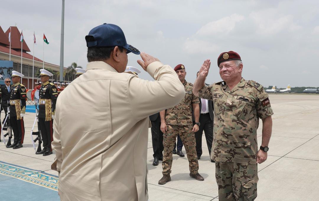 Raja Abdullah II dengan seragam militernya dan Prabowo dengan pakaian safari berwarna kremnya turun dari mobil secara bersamaan.