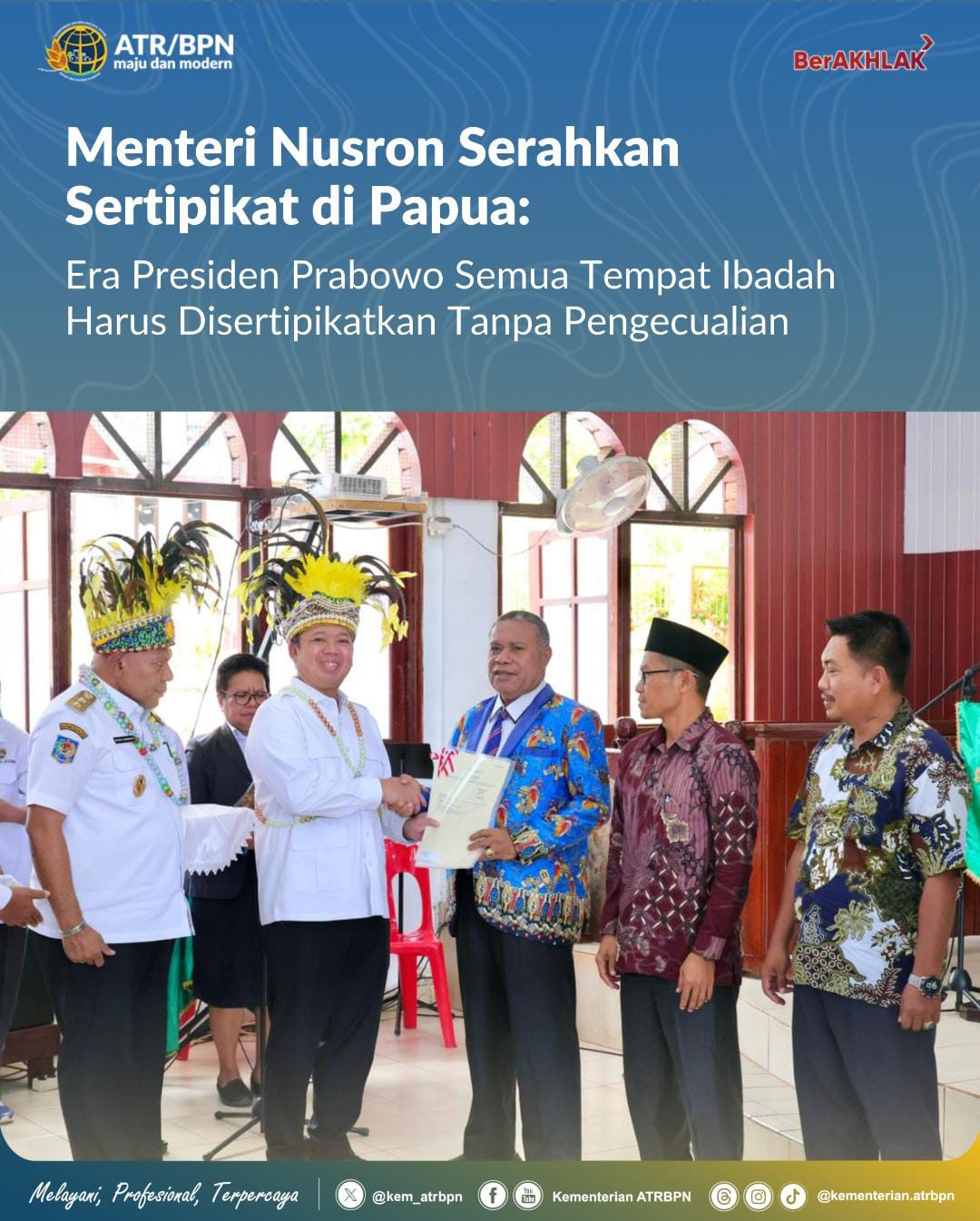 Menteri Nusron mengapresiasi dukungan pemuka agama dan pemerintah daerah yang terus menjaga kerukunan di Papua. Ia berharap, percepatan sertipikasi tempat ibadah dapat memberikan rasa aman kepada umat serta memperkuat kualitas pelayanan pertanahan di wilayah tersebut.