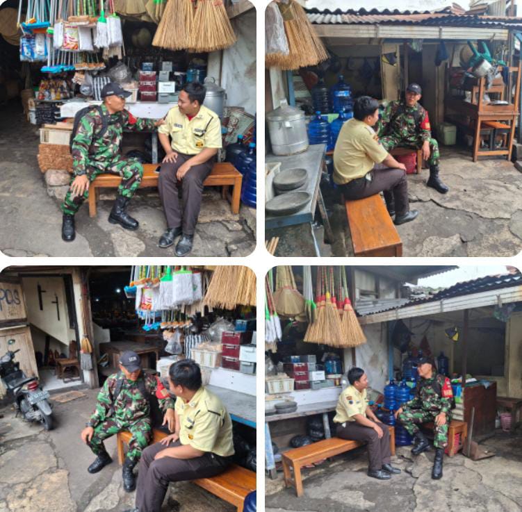 Surakarta, Babinsa Kelurahan Danukusuman Koramil 03/Serengan Kodim 0735/Surakarta Serda Tito Sambangi satpam Pasar Saudara Sulistyo di Pasar Tradisional Harjodaksino Jln. Yos Sudarso No. 34 Danukusuman Serengan Kota Surakarta, (24/11/2025)