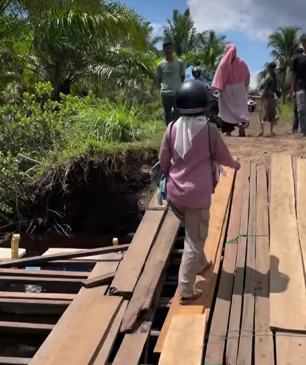 Bisa dibangun dulu jembatan darurat menggunakan pohon kelapa atau kayu.