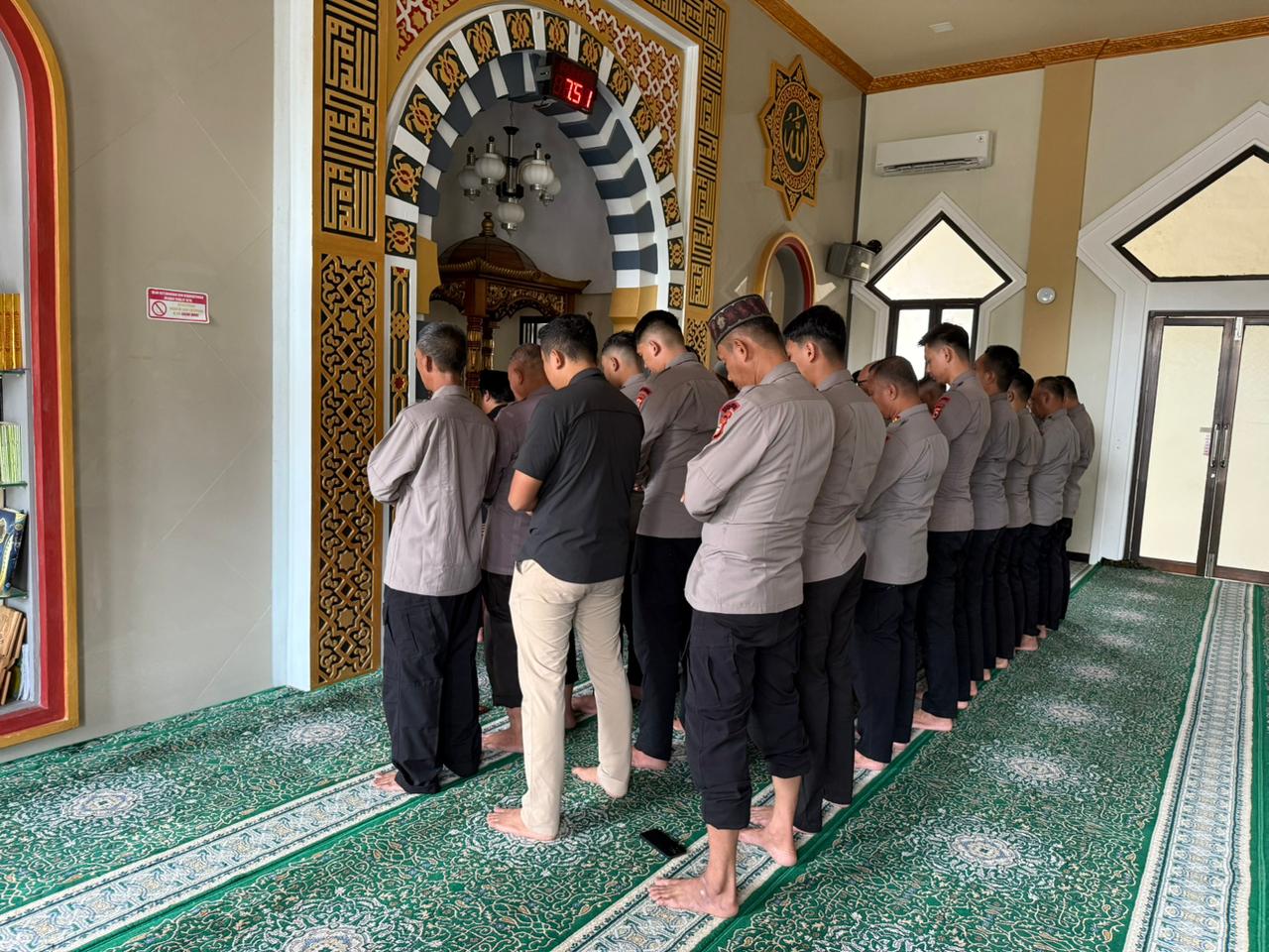MAKASSAR — Personel Makosat Brimob Polda Sulsel melaksanakan Salat Gaib untuk korban bencana alam di Pulau Sumatera.