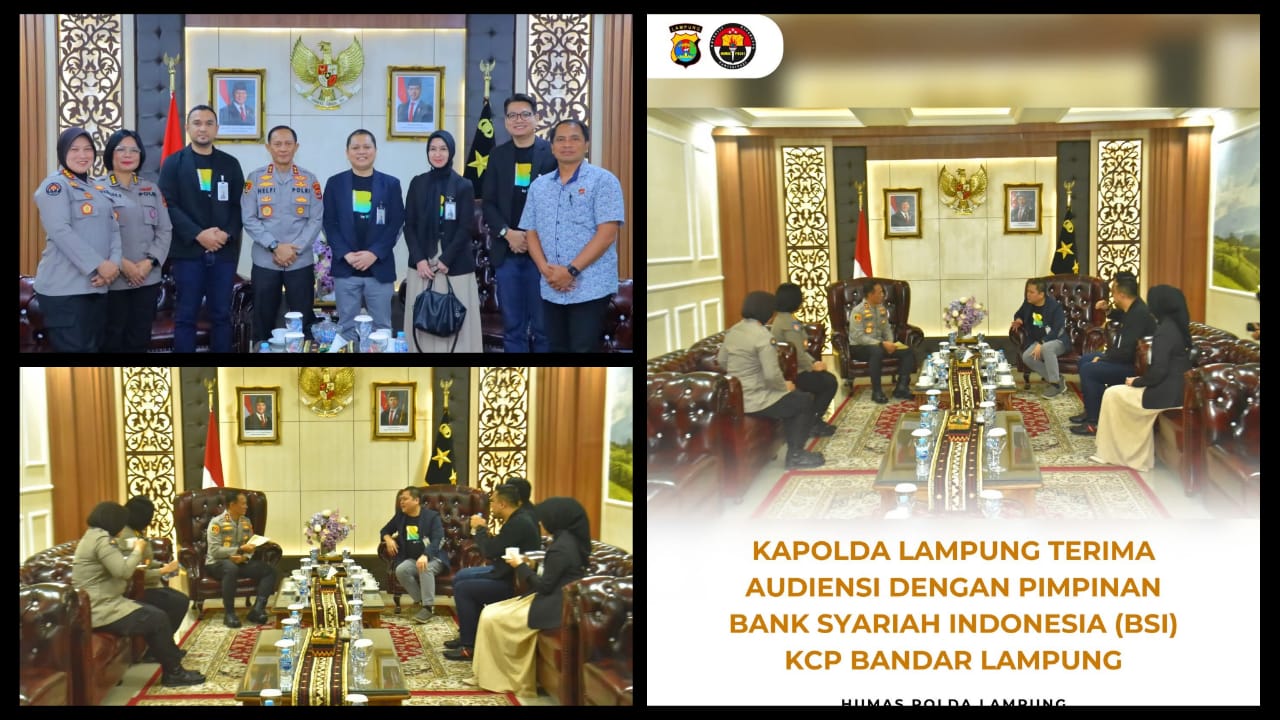 Jumat, 5 Desember 2025 – Kapolda Lampung Irjen Pol Helfi Assegaf, didampingi Kabid Keu dan Kabid Humas, menerima kunjungan audiensi dan silaturahmi dari Pimpinan Bank Syariah Indonesia (BSI) KCP Bandar Lampung di Ruang Tamu Kapolda.