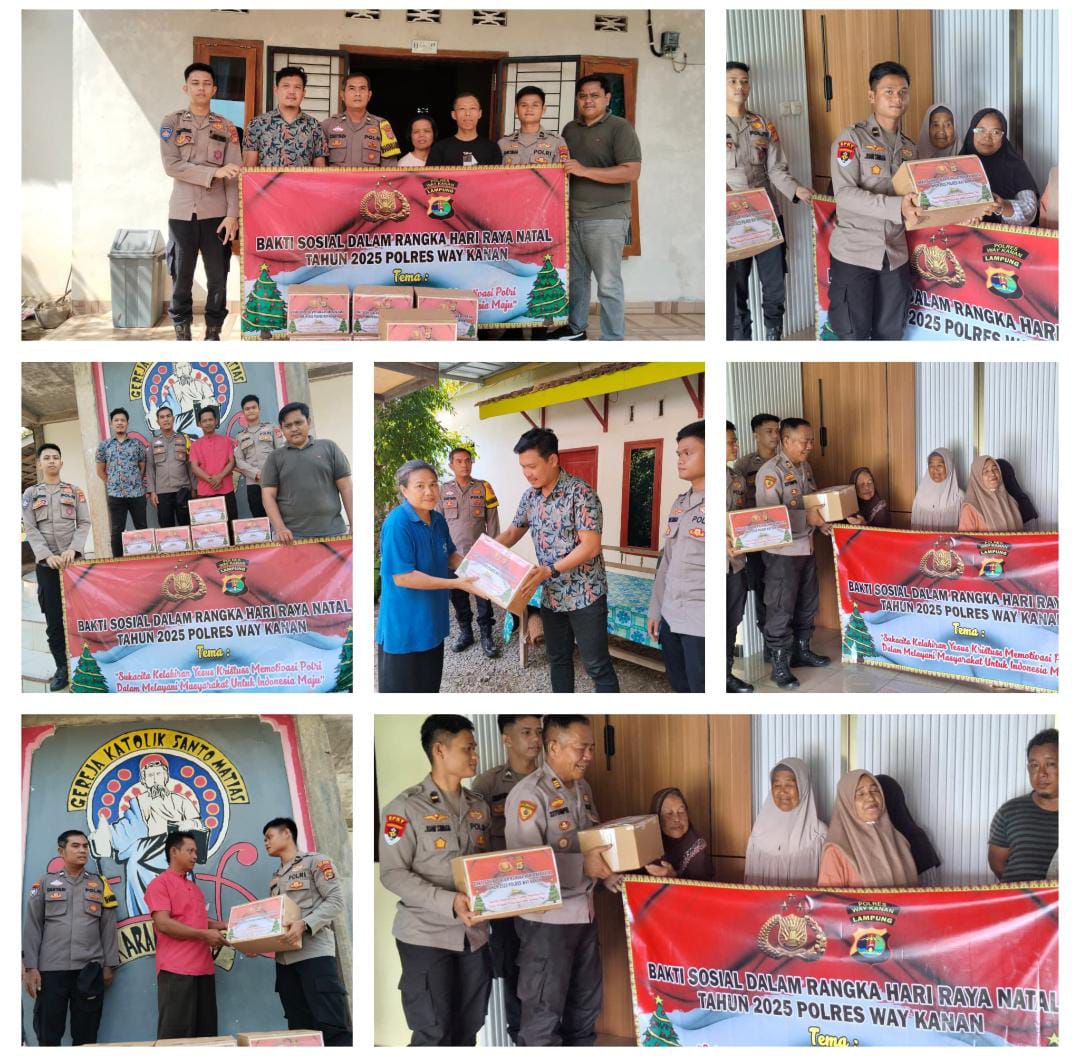 Kapolres Way Kanan AKBP Adanan Mangopang melalui PS Kabag SDM Polres Way Kanan AKP J.T.H. Sitompul menjelaskan bahwa dalam rangka menyambut hari Natal tahun 2025, Polres Way Kanan melaksanakan kegiatan bantuan sosial paket sembako berupa beras, gula pasir, minyak goring, kecap manis, full cream dan indomie instan di tempat ibadah umat nasrani.
