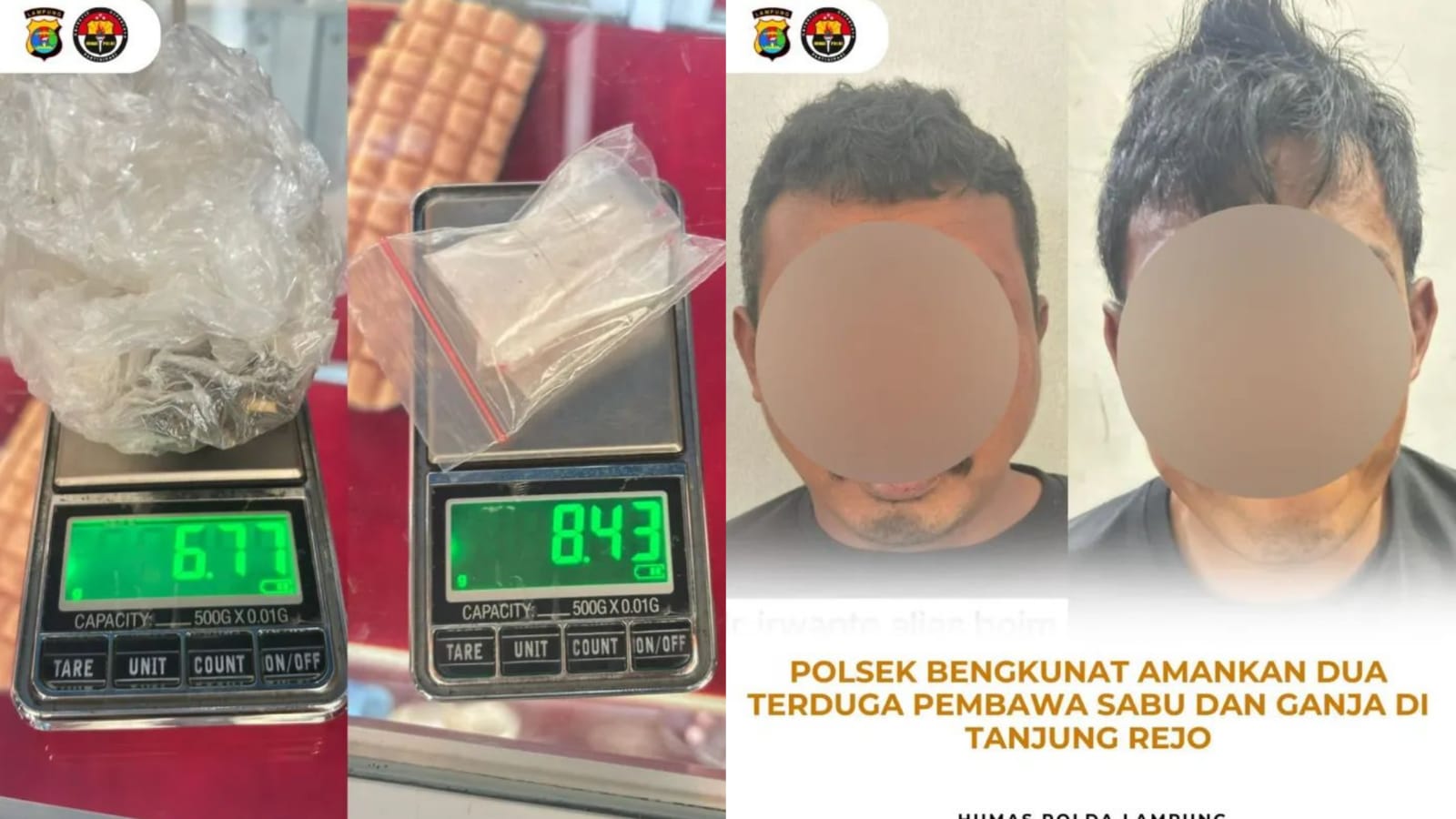 Pesisir Barat, 11 Desember 2025 – Unit Reskrim Polsek Bengkunat amankan 2 pria bawa narkotika jenis sabu dan ganja di Pekon Tanjung Rejo, Kamis (11/12/25) dini hari. Petugas juga amankan 1 terduga pemesan narkoba.