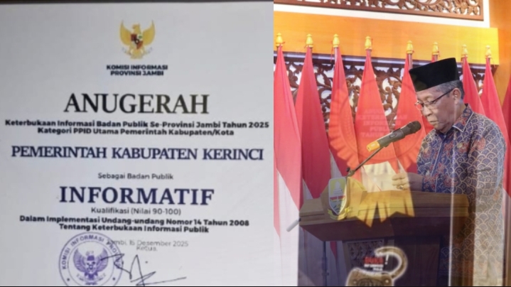 Jambi ginewstvinvestigasiinews.com – Pemerintah Kabupaten Kerinci kembali menorehkan prestasi membanggakan dalam bidang Keterbukaan Informasi Publik. Untuk tahun kedua berturut-turut, Pemkab Kerinci berhasil mempertahankan predikat Badan Publik “Informatif” dengan kualifikasi nilai tertinggi 90–100, yang diberikan oleh Komisi Informasi (KI) Provinsi Jambi pada Anugerah Keterbukaan Informasi Publik Tahun 2025.