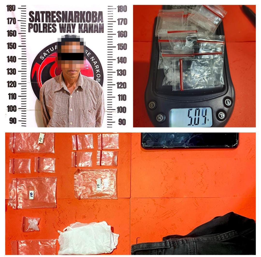 Seorang pria berinisial EVS alias Puji (47) warga Kampung Labuhan Jaya, Gunung Labuhan Kabupaten Way Kanan diamankan Satresnarkoba Polres Way Kanan karena diduga melakukan peredaran gelap narkotika bukan tanaman jenis sabu Minggu (21/12/2025).