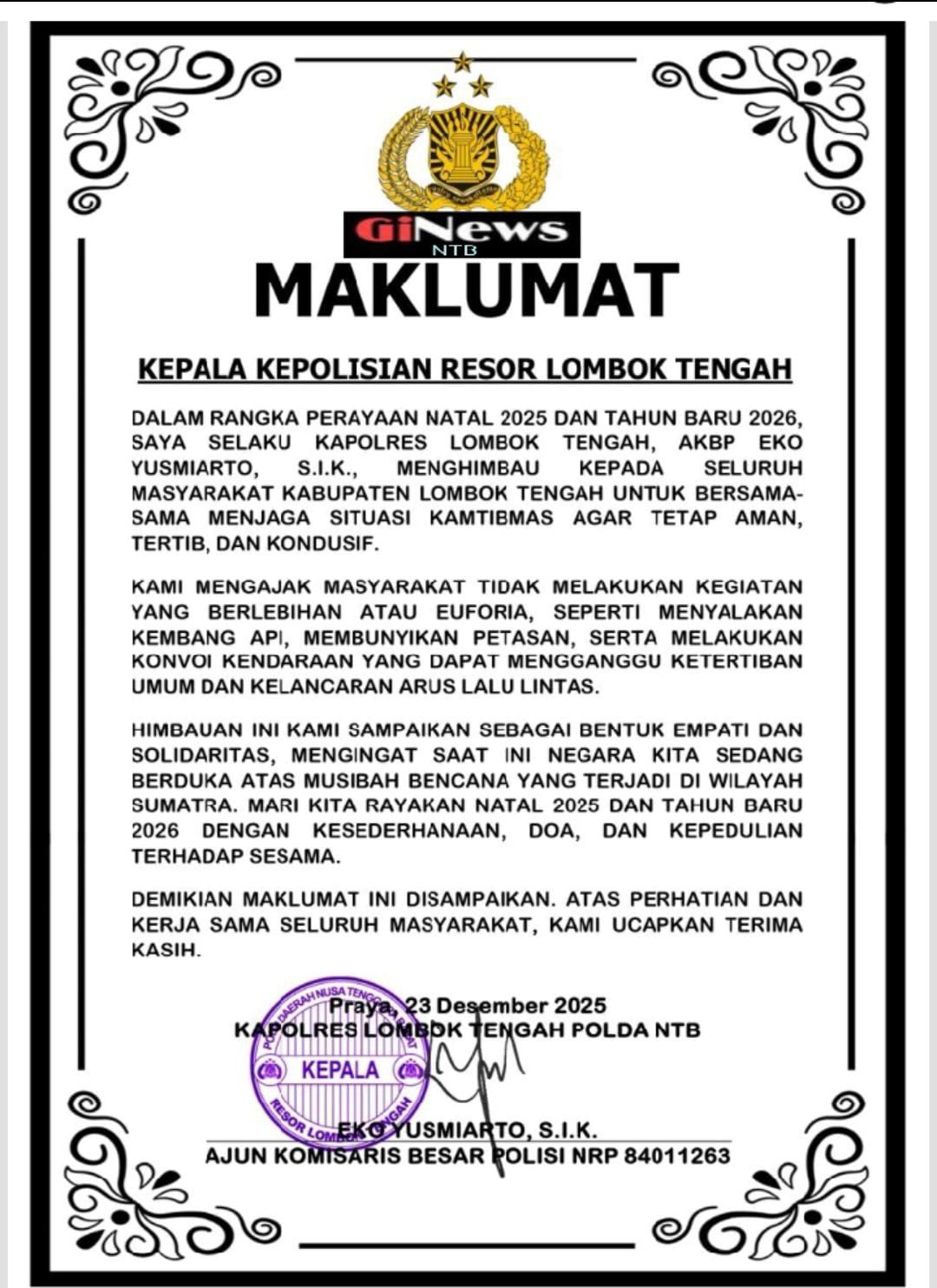 Maklumat tersebut disampaikan di Praya pada 23 Desember 2025 dan ditandatangani langsung oleh Kapolres Lombok Tengah, AKBP Eko Yusmiarto, S.I.K., ( Tim JILT).