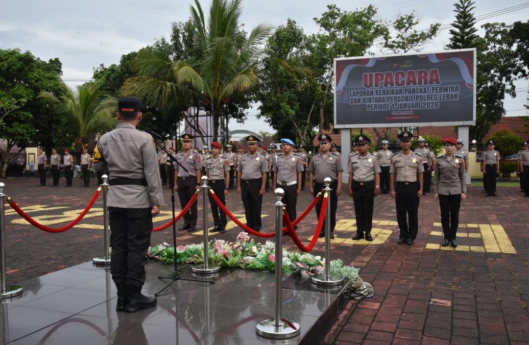 Kapolres Lebak Polda Banten AKBP Herfio Zaki, SIK, MH memimpin langsung upacara kenaikan pangkat terhadap 76 personel Polres Lebak yang dilaksanakan di halaman Mapolres Lebak. Kamis (31/12/2025).