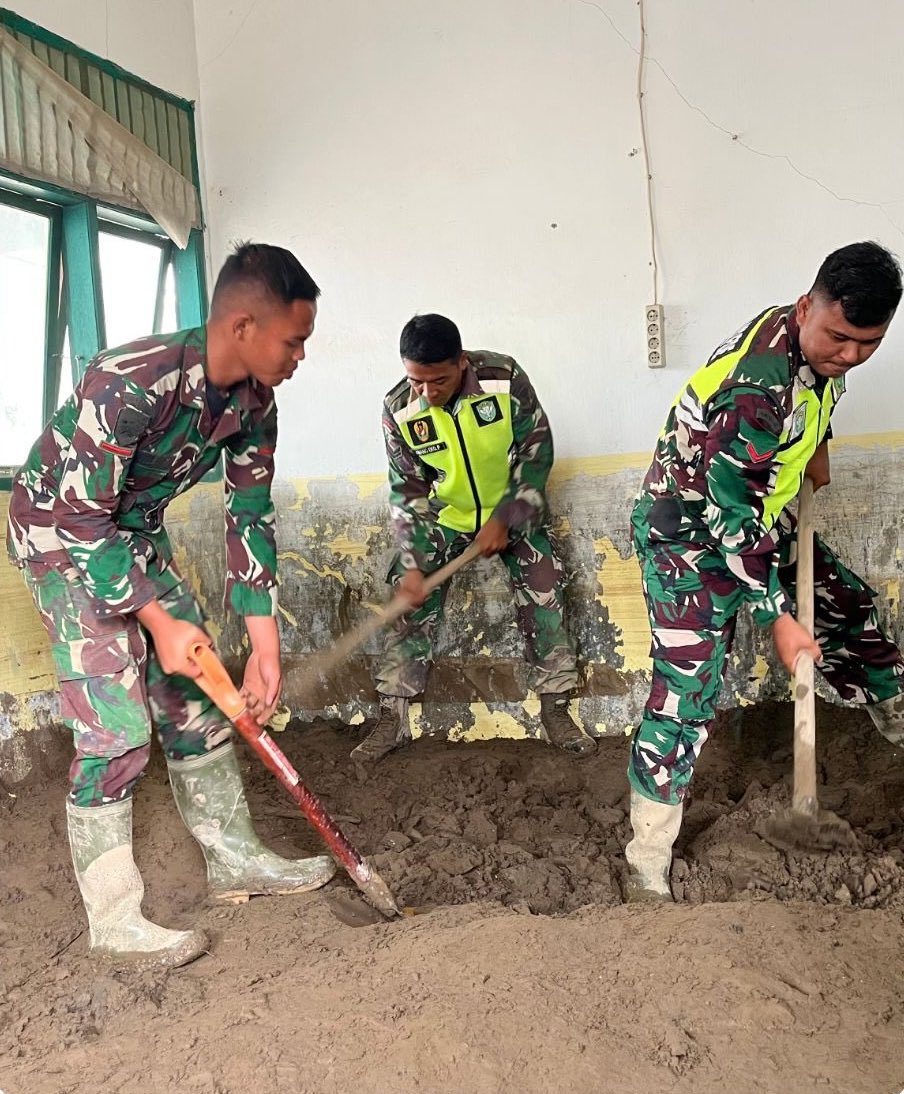 Para personel membersihkan baik bagian dalam maupun luar gedung sekolah. Lumpur-lumpur yang masih tersisa dan sudah mengeras disiram dengan air. Tumpukan material sampah yang terbawa banjir dan longsor pun dibersihkan.