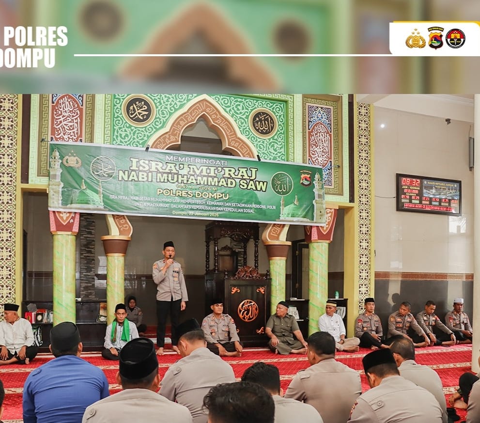 Jajaran Kepolisian Resor Dompu melaksanakan peringatan Isra Mi’raj Nabi Besar Muhammad SAW Tahun 1447 H/2026 M dengan mengusung tema,” Memperteguh Keimanan dan Ketaqwaan Personel Polri untuk Masyarakat dan Kepedulian Sosial”. Kegiatan tersebut berlangsung pada Kamis (22/01/2026) sekitar pukul 08.00 Wita bertempat di Masjid Miftahul Jannah Polres Dompu.