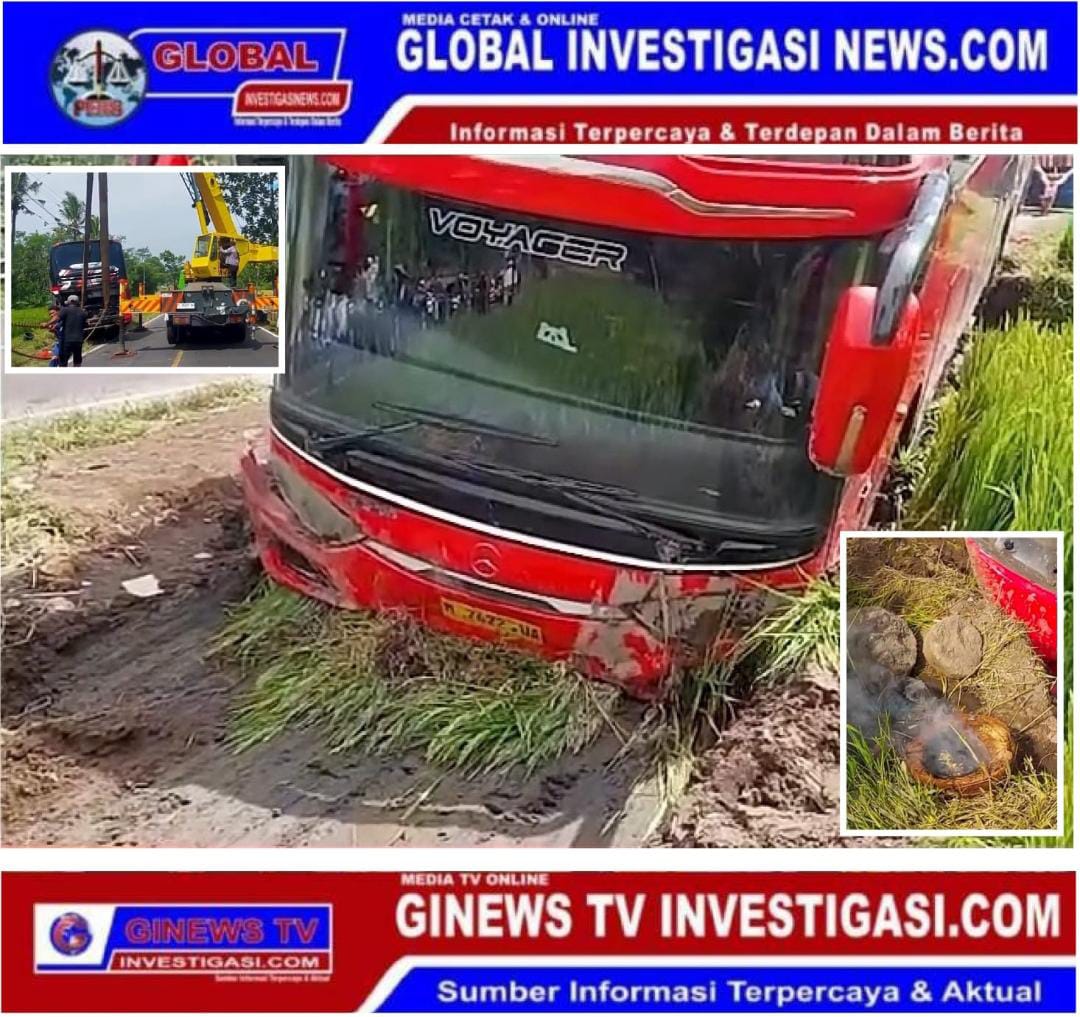 Jember – GINewstv ~ Bus pariwisata dengan 60 penumpang asal Kalimantan mengalami kecelakaan di Jalan Raya Desa Sumber Kejayan, Kecamatan Mayang, Jember, pada Kamis (22/1/2026). Tidak ada korban jiwa dalam peristiwa tersebut, seluruh penumpang selamat. Proses evakuasi hari pertama dan ketiga bangkai bus yang masuk sawah belum berhasil.